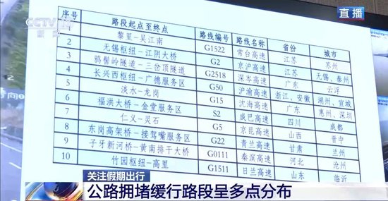 交通运输部路网中心发布了全国高速公路预计易发生拥堵缓行的10个路段,大部分集中在长三角、粤港澳大湾区、成渝地区。尤其是国家高速公路主要通道、城市周边及通往热门景区公路的局部路段车辆流量比较集中,容易发生拥堵缓行情况。