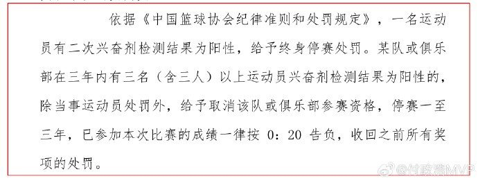 中国篮协新规加大了篮球兴奋剂的处罚力度,若一名球员两次阳性则终身禁赛,俱乐部三年内有三名球员阳性取消俱乐部参赛资格,收回之前所有奖项!
