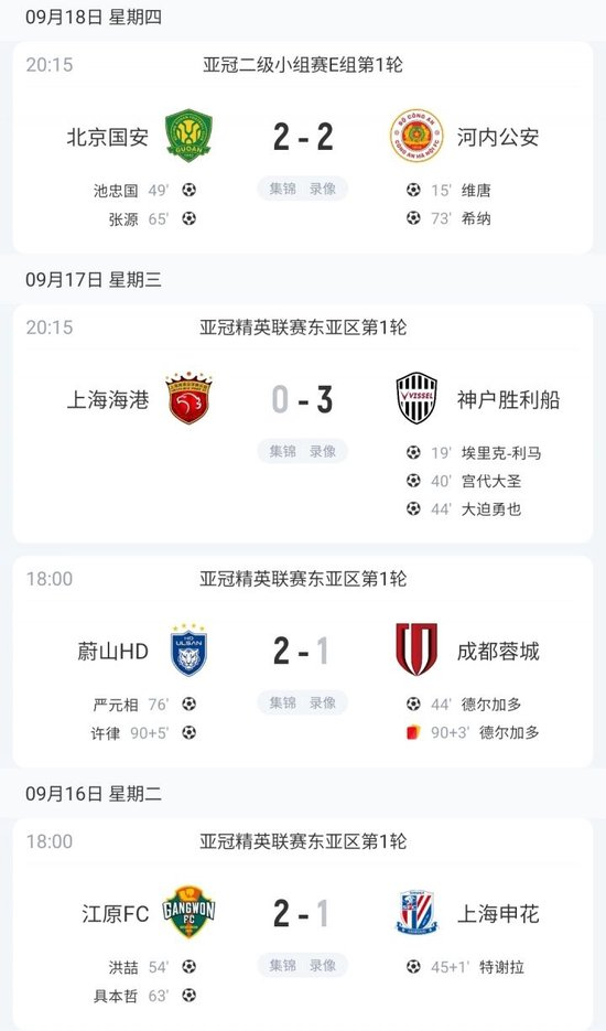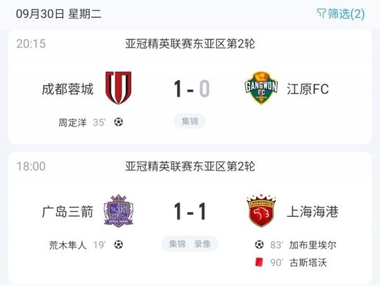 直播吧09月30日讯 亚冠精英联赛东亚区第2轮,成都蓉城1-0击败韩国球队江原FC,取得中超球队在本届亚冠精英/二级联赛正赛的首胜,4支中超球队目前战绩为1胜2平3负。