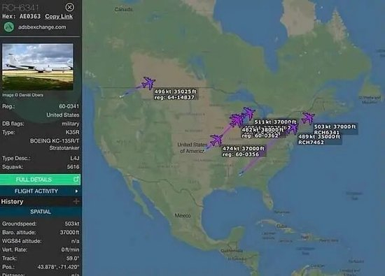 飞行追踪数据显示美军空中加油机启程 图源:报道截图