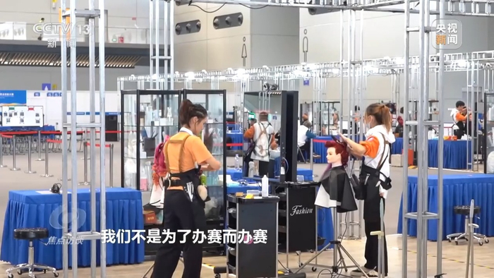 美发赛项解说员 岳静茹:赛场升级,智慧屏的一些赛题展示、一些要求,传统比赛意义上,很多赛题以及图片可能是纸质的,可能会出现打印偏色以及阅读的时候关键信息遗漏。但是一直显示在屏幕上,有职业场景的保留,还有比赛功能性的保留,选手可能会遇到问题,举手系统连接到我们的后台,这样记录就会比人工记录更加客观和科学。