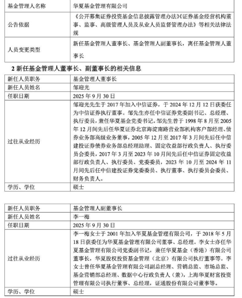 9月30日,华夏基金公告称,新任邹迎光为董事长、李一梅为副董事长。任职自今年9月30日起。公告显示,邹迎光同时还担任中信证券党委副书记、总经理、执行委员,兼任华夏基金党委书记;李一梅同时任华夏基金董事、总经理,党委副书记,兼任华夏基金(香港)董事长,华夏股权投资基金管理(北京)执行董事等。