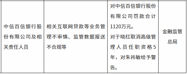 针对上述违法违规行为,国家金融监督管理总局对中信百信银行罚款合计1120万元;对于晓红取消高级管理人员任职资格5年,对朱祎敏给予警告。