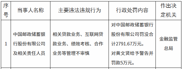 针对上述违法违规行为,国家金融监督管理总局对邮政储蓄银行罚没合计2791.67万元;对黄文贤给予警告并罚款5万元。