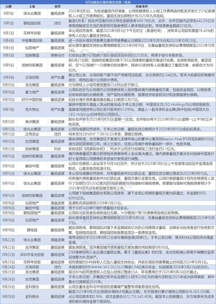 公司公告及消息方面,持有花样年控股现有票据84%的持有人已加入重组支持协议,并延长提前同意费截止时间至10月3日;龙光集团超过80%的同意债权人已加入经修订整体CSA;弘阳地产延长基础重组支持协议费用期限至10月17日,呈请聆讯现延期至2026年3月23日;中骏集团控股进一步延长提前同意费及基本同意费截止日期至10月16日和10月23日;时代中国控股拟延长境外债务重组最后截止日期至12月31日;泛海控股未能如期兑付FANHAI 14.5 05/23/21剩余1.34亿美元本金,拟展期至2026年3月23日前兑付,公司79套不动产将被司法拍卖,涉及债务约2.04亿元;正商实业尚未支付ZENENT 7 09/12/25本息;中国恒大清盘人拟出售中国恒大及CEG Holdings所持有的恒大物业股份;禹洲集团股份合并已于9月15日生效;世茂集团100亿港元贷款获展期三年;远洋集团境内债务重组方案投票时间延期至9月30日。