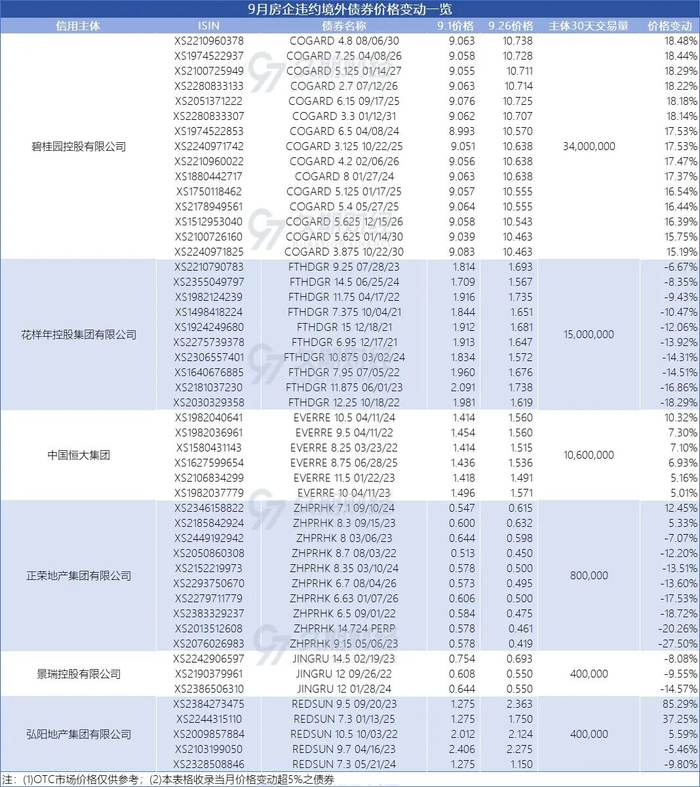 碧桂园计划对其本金规模超百亿元的境内债券启动重组。此举或增强债权人信心,月内公司旗下美元债券价格整体呈现上涨态势,市场交投亦较为活跃。COGARD 4.8 08/06/30、COGARD 7.25 04/08/26等6只债券涨幅超18%,美元债全线回升至10美元以上区间。