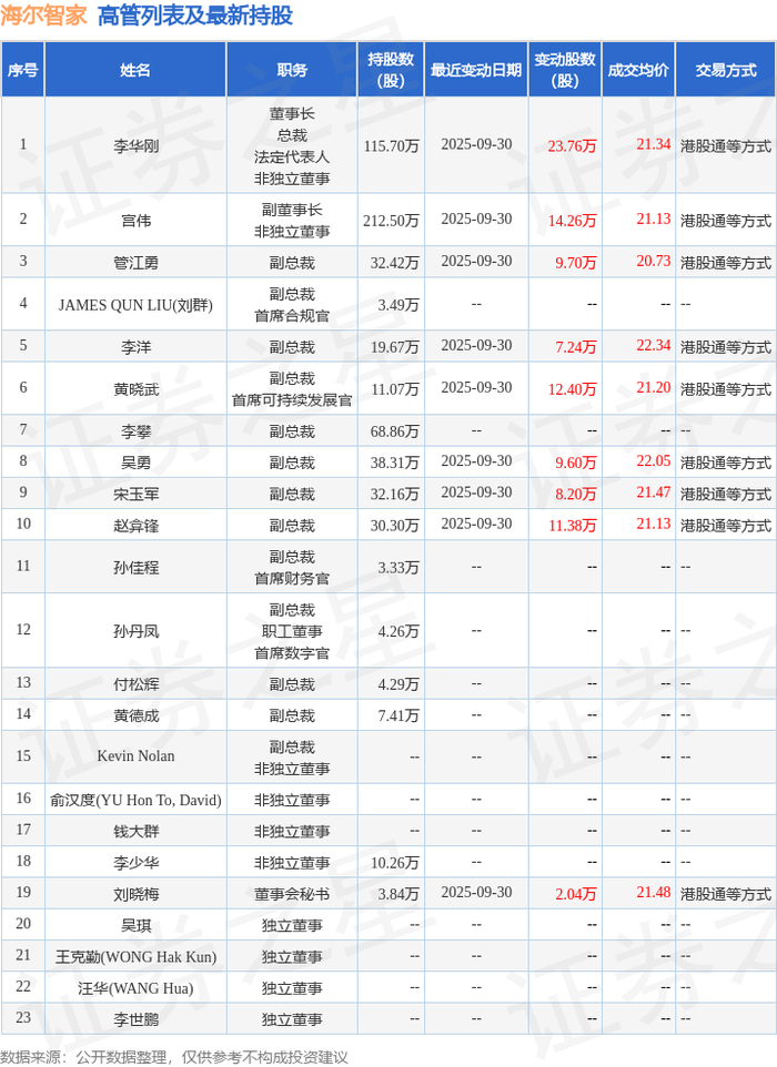 证券之星消息,根据9月30日市场公开信息、上市公司公告及交易所披露数据整理,海尔智家(600690)最新董监高及相关人员股份变动情况:2025年9月30日公司董事长,总裁李华刚、董事,副总裁,财务总监宫伟、副总裁管江勇、副总裁李洋、副总裁黄晓武、副总裁吴勇、副总裁宋玉军、副总裁赵弇锋、董事会秘书刘晓梅共增持公司股份98.58万股,占公司总股本为0.0104%。变动期间公司股价下跌0.86%,9月30日当日收盘报25.33元。