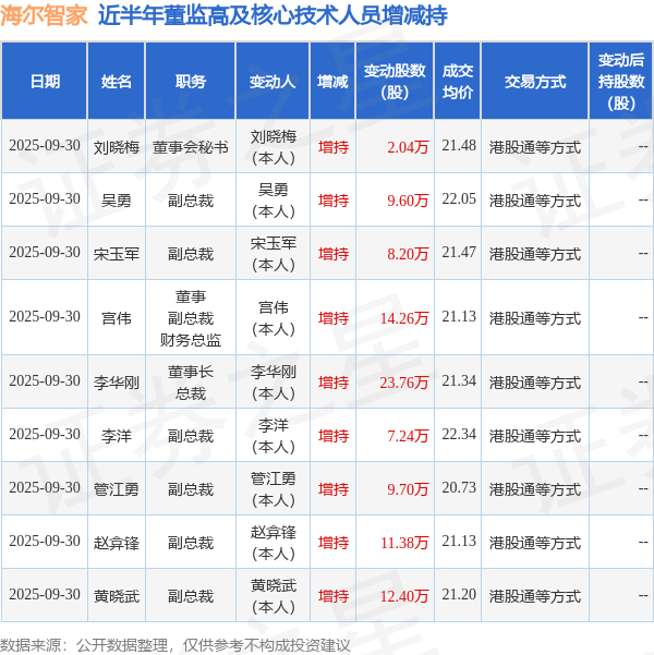海尔智家近半年内的董监高及核心技术人员增减持详情如下: