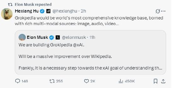马斯克还转发了xAI技术人员 Hexiang Hu的一条帖子,称“Grokpedia将是世界上最全面的知识库,拥有丰富的多模式资源:图像,音频,视频……”