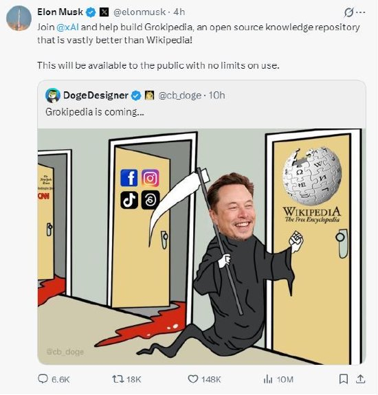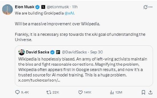 在另一条帖子中,马斯克写道:“加入xAI,帮助构建Grokipedia,这是一个比维基百科更好的开源知识库!这将对公众开放,没有使用限制。”