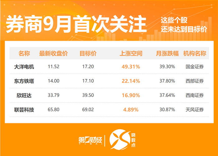 大洋电机的涨幅空间超49%,该股最新收盘价报11.52元,国金证券在9月19日发布的研报中给出了17.2元的目标价。
