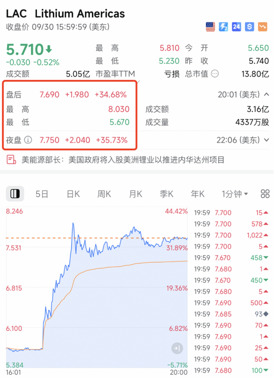 美东时间周二(9月30日),美国能源部长克里斯·赖特(Chris Wright)表示,美国政府将持有加拿大矿业巨头美洲锂业(Lithium Americas)少量股份。受该消息刺激,美洲锂业股价在美股盘后交易中一度暴涨超40%。
