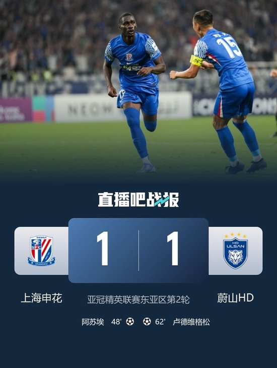 直播吧10月1日讯 北京时间10月1日20:15,亚冠精英联赛东亚区第2轮,上海申花在上海体育场迎战蔚山HD。上半场,阿苏埃错失单刀机会,双方互有攻守,但均未破门;下半场,阿苏埃补射破僵,卢德维格松扳平比分。