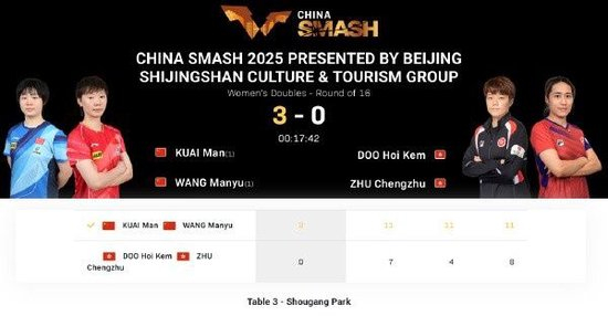 直播吧10月1日讯 2025年WTT中国大满贯女双1/8决赛,王曼昱/蒯曼3-0杜凯琹/朱成竹,晋级八强。