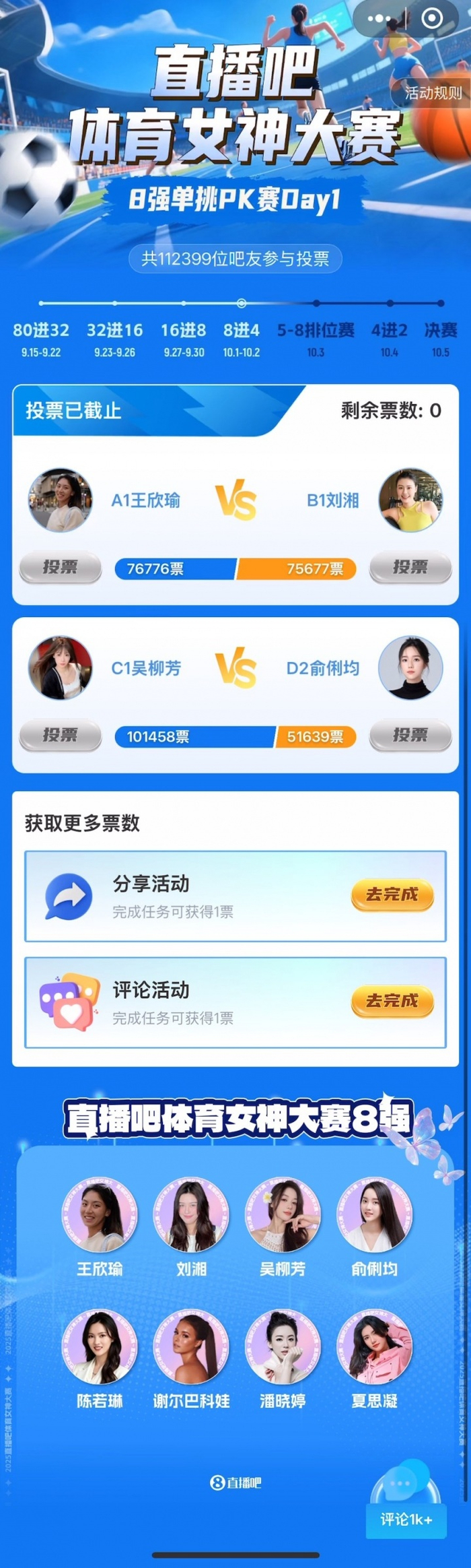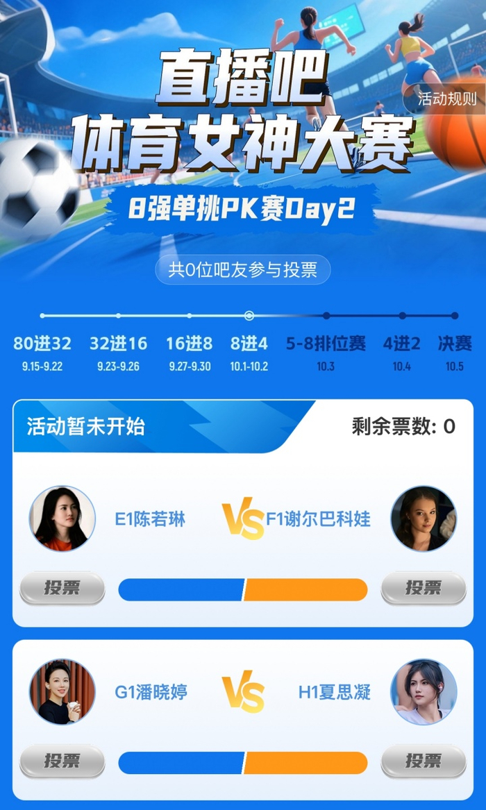 2025年『直播吧体育女神大赛』昨日结束了8强单挑PK赛Day1的争夺,具体赛果如下: