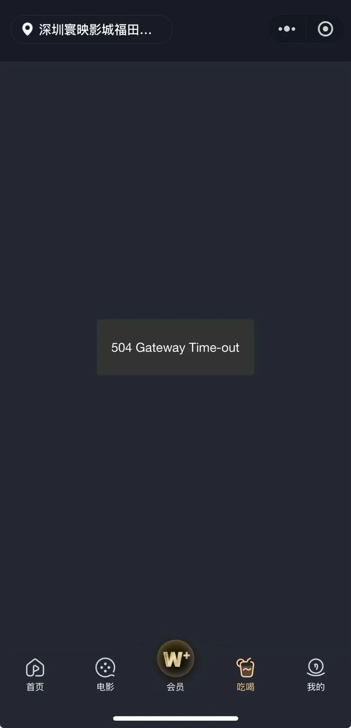 记者实测发现,截至今日18:00,记者多次尝试,仍无法登录万达电影小程序。此外,点击万达电影小程序“吃喝”专区(该活动所在专区),则提示错误。