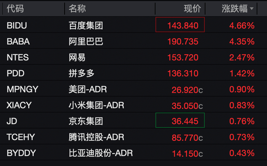 个股方面,百度集团、阿里巴巴涨超4%,网易涨超2%,拼多多涨超1%。