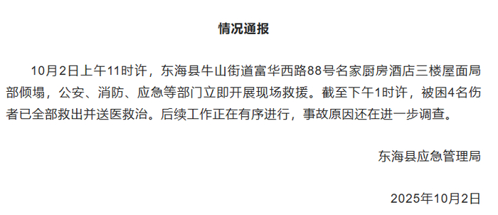 ·江苏东海县一饭店举办宴席时房顶塌陷,当地应急管理局通报:被困4名伤者已全部救出。