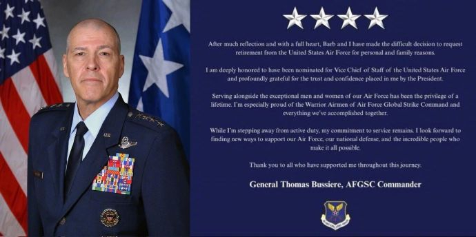 #敏感时刻美空军上将申请退役#【敏感时刻,美军一核武器指挥官突然宣布退役】#美空军核武司令官申请退役# 据美国《国会山报》10月2日报道,在美国防长赫格塞思召集全球美军将领开会训话后第二天,美国空军上将托马斯·比西尔申请退役。