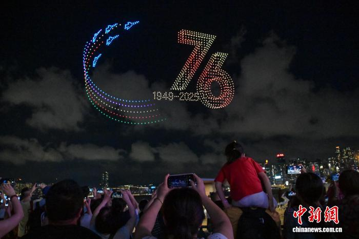 10月2日,为庆祝中华人民共和国成立76周年,由紫荆文化集团主办、紫荆杂志社承办的2025年国庆无人机汇演在香港湾仔海滨举行。图为香港市民观看无人机汇演。 中新社记者 陈永诺 摄