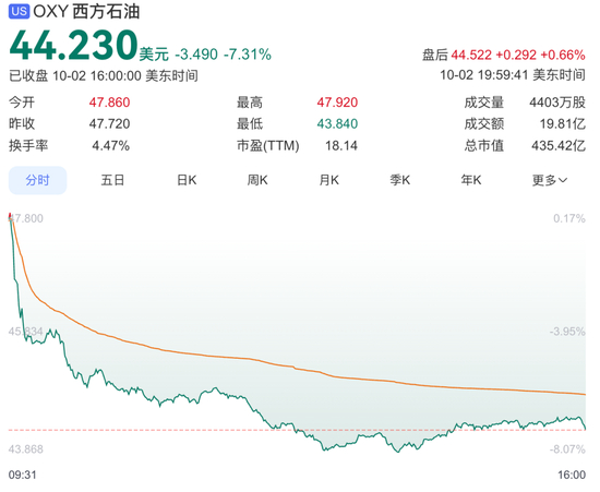 当地时间10月2日,西方石油股价大跌。当天盘前,西方石油股价一度涨超2%,但美股开盘后,公司股价快速下挫,一度跌超8%。截至收盘,公司股价跌7.31%,报44.23美元/股。