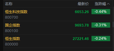 今日港股三大指数集体低开,恒生指数跌0.24%,报27221.46点,恒生科指跌0.44%,国企指数跌0.31%。盘面上,科网股跌多涨少,阿里巴巴涨超1%,哔哩哔哩跌超2%,京东、百度跌超1%,网易跌1%;稳定币概念股活跃,云锋金融涨超4%;黄金股回调,山东黄金跌超2%;汽车股走弱,小鹏汽车跌超2%。