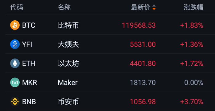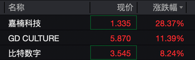 数字货币市场大涨。比特币盘中突破11.9万美元,以太坊突破4400美元。数字货币概念股暴涨。嘉楠科技涨超28%,GD CULTURE涨超11%,比特数字涨超8%。