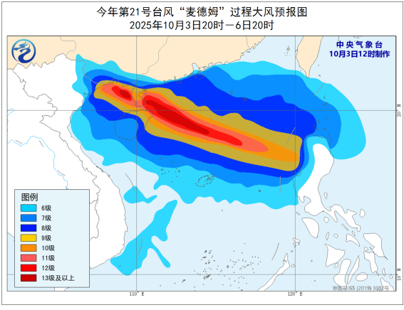 大风预报:3日夜间至6日白天,广东雷州半岛和中西部沿海、广西沿海、海南岛及沿海、西沙群岛、中沙群岛、黄岩岛附近海域将有6~8级风,南海中北部、琼州海峡、北部湾中北部有9~11级风,“麦德姆”中心经过的附近海域或地区风力可达12~14级、阵风15~17级。