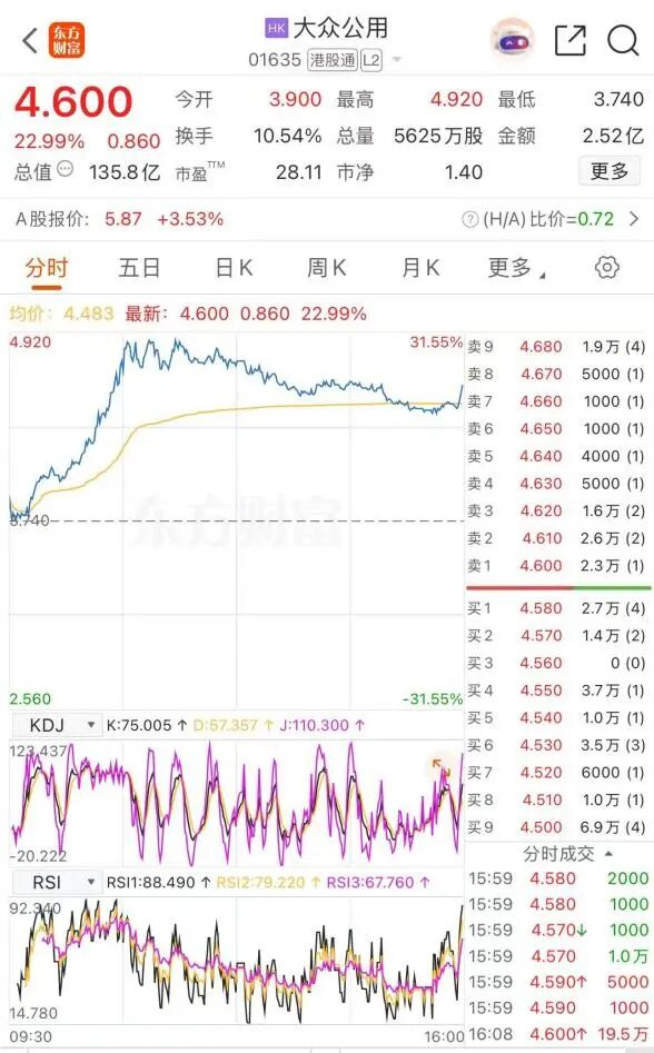 10月3日,大众公用H股盘中涨超30%,股价创下历史新高。截至收盘,大众公用H股涨22.99%,报4.6港元/股。近4个交易日,大众公用H股累计涨幅接近60%。