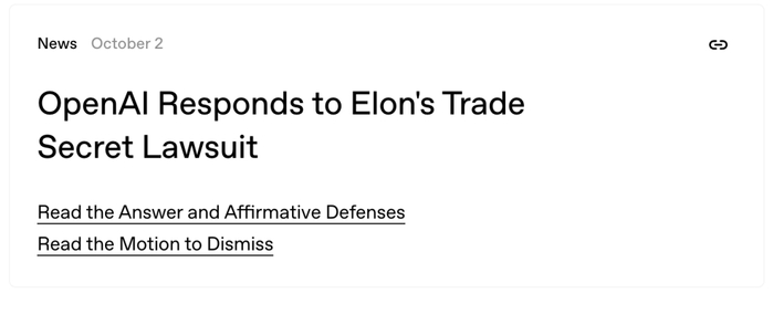 北京时间10月3日上午,OpenAI通过官方新闻账号对马斯克最新以诉讼为幌子的骚扰策略作出回应。OpenAI表示,不需要也不想要任何人的商业机密。OpenAI将保护员工,不会被马斯克试图欺凌他们的行为所吓倒。