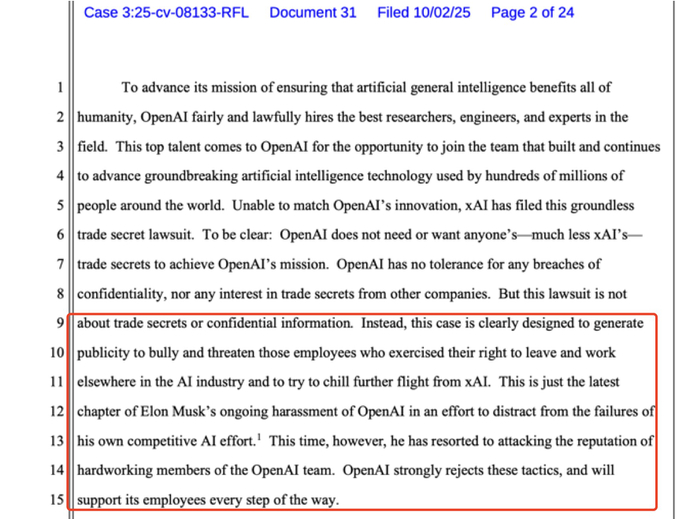 诉讼文件显示,OpenAI被指挖走了八名xAI员工,属于一项“有组织的计划”,目的是获取机密信息。xAI上个月已经针对其中一名员工Xuechen Li提起单独诉讼。