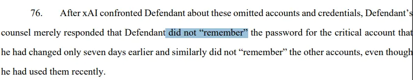 当xAI就此当面质问时,Li的律师给出了令人难以置信的答复:Li“不记得”密码。要知道,关键账户的密码是7天前他才改过的。