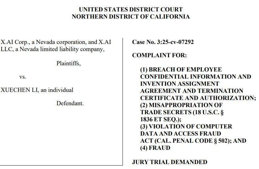 8月28日,xAI以窃取商业机密的名义将Li告上加州北区联邦法院。起诉书显示,xAI对Li进行了多项指控,分别是违反《员工保密信息与发明转让协议》《离职证明与授权书》,盗取商业机密,违反《计算机数据与访问欺诈法》和欺诈。