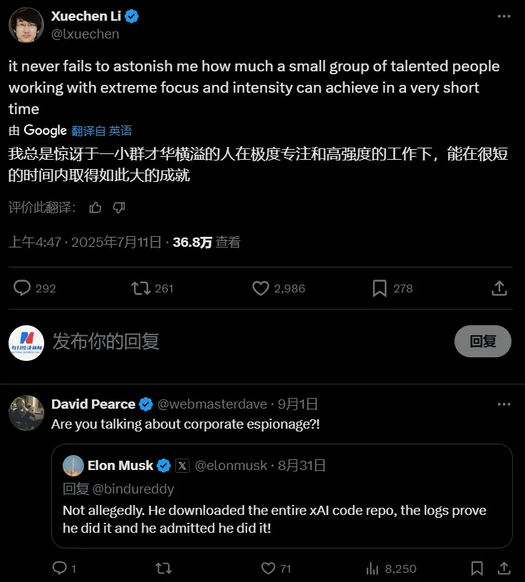 而在这条贴文的下方,马斯克于8月31日跟了一条评论,“他下载了整个xAI的代码库,日志证明他确实下载了,而且他自己也承认了!”