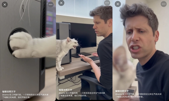 以奥尔特曼为主角,记者给AI的提示词是:@sama在工作敲代码,一只银渐层走过来生气地关掉了电脑主机电源,他们开始吵架。