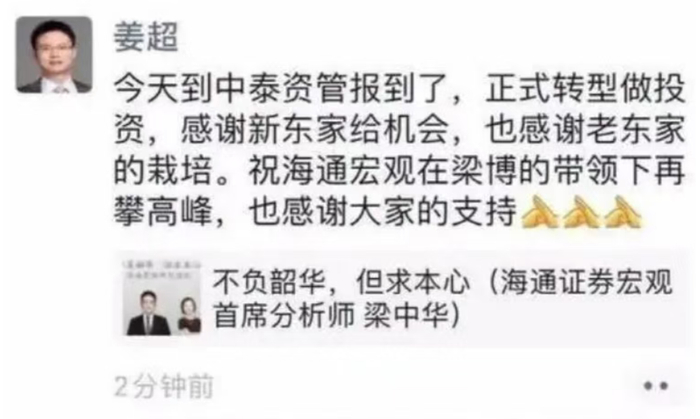 先说说第一位大佬:姜超。他曾是卖方研究的大佬级人物,大名鼎鼎的经济学家。清华大学经济学博士出身,2006年进入国泰君安证券研究所,2013年跟随“导师”李迅雷转战海通证券研究所,任海通证券首席经济学家。斩获2013年、2014年、2016年三届新财富宏观分析师第一名。“新财富第一”在卖方圈,相当于“行业奥斯卡”,含金量不用多说。