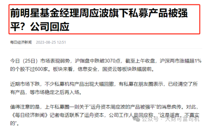 但私募的路,比他想的难多了。2023年8月,市场大跌时,私募圈突然传出“周应波旗下私募产品被强平”的消息,但公司方面回应:消息不实,公司产品未设置强平机制,不会因为净值波动出现平仓。公司同时表示,中长期坚定看好中国经济转型升级、高质量发展,看好资本市场调整2年多之后的投资机会。