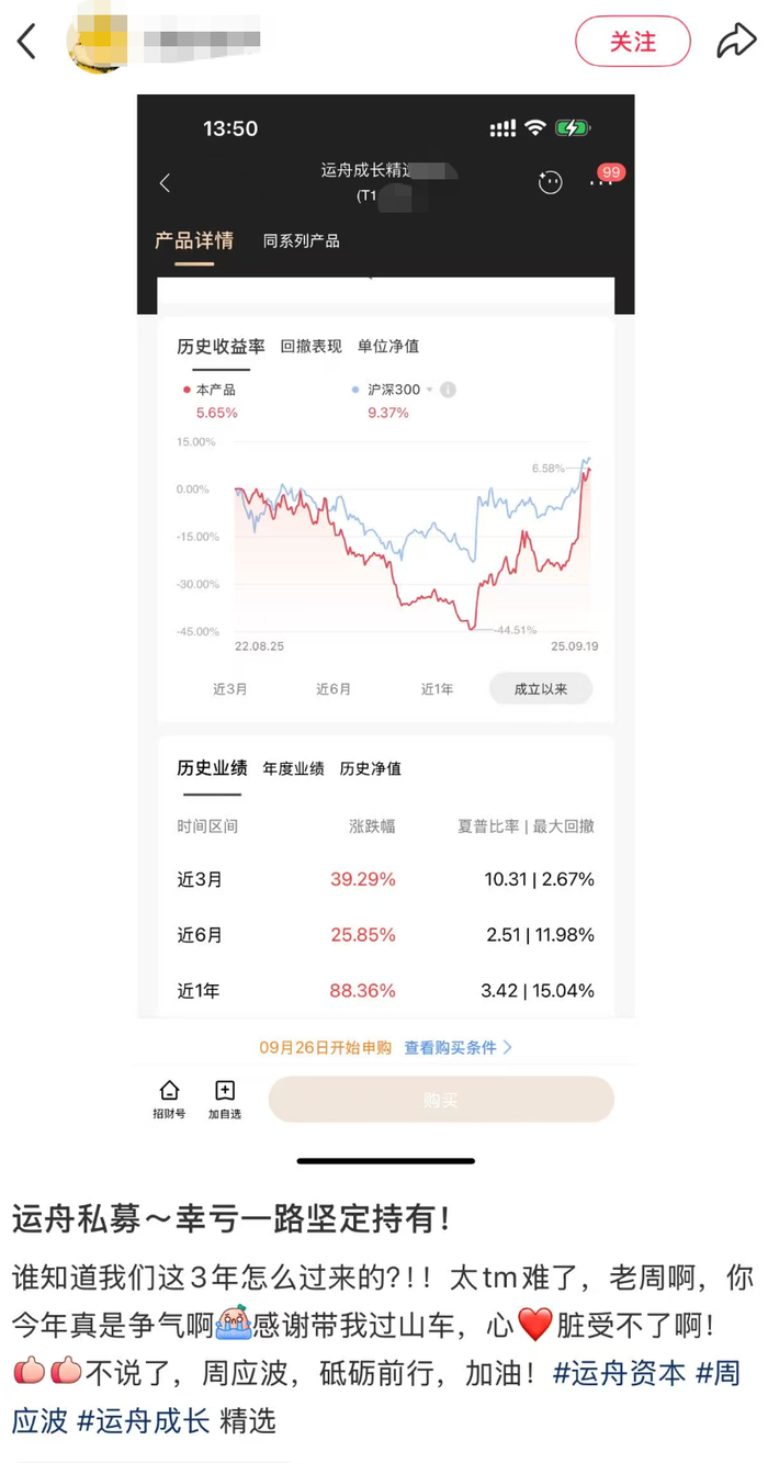 图片显示,这只产品最大亏损幅度达到44.51%,截至9月19日净值已回升到1以上,浮出水面。近一年来88.36%的反弹,为产品爬坑打下了坚定基础。面对这种过山车式的走势,投资者说出了掏心底的话:“谁知道我们这3年怎么过来的?老周啊,你今年真是争气啊!感谢带我过山车,心脏受不了啊!不说了,周应波,砥砺前行,加油!”