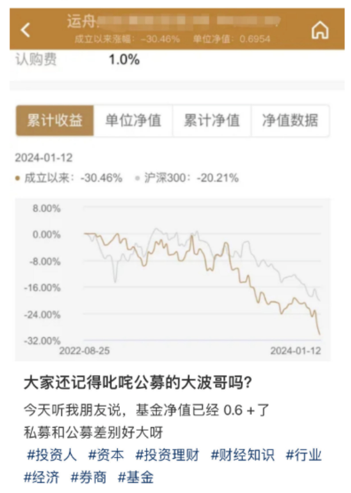 那之后,周应波和运舟资本就很少再对外提产品情况,有点“闷头扛”的意思。直到日前,有持有人在社交平台晒出了其持有的运舟成长精选X号的产品净值,称“幸亏一路坚定持有!”