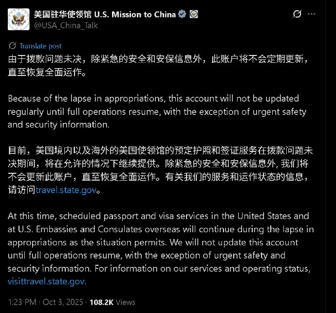 #美驻华使领馆官号宣布停更#[美国驻华使领馆:拨款出问题,不会定期更新了]北京时间10月3日下午1时23分,美国驻华使领馆在美国社交平台X上的官方账号上宣布,由于拨款问题未解决,除紧急的安全和安保信息外,此账户将不会定期更新,直至恢复全面运作。