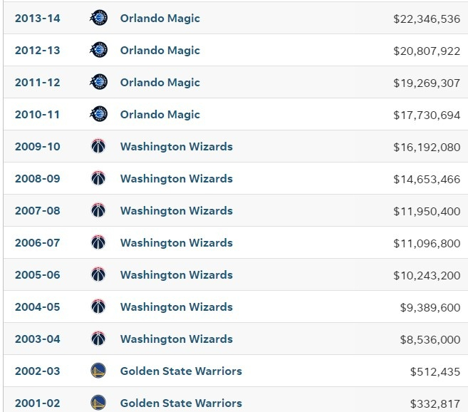 阿里纳斯的NBA薪资列表,生涯薪资总额1.6亿美元