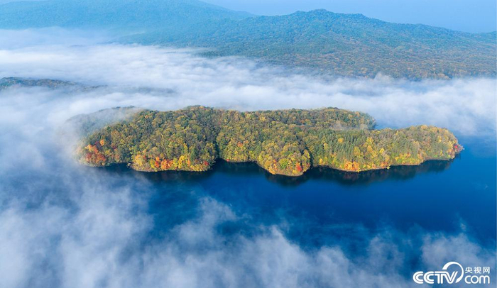 10月2日,黑龙江省哈尔滨市五常市,磨盘山拉林河水库云雾妖媃,湖水倒映着五彩斑斓山林与云雾,美轮美奂,宛如仙境。