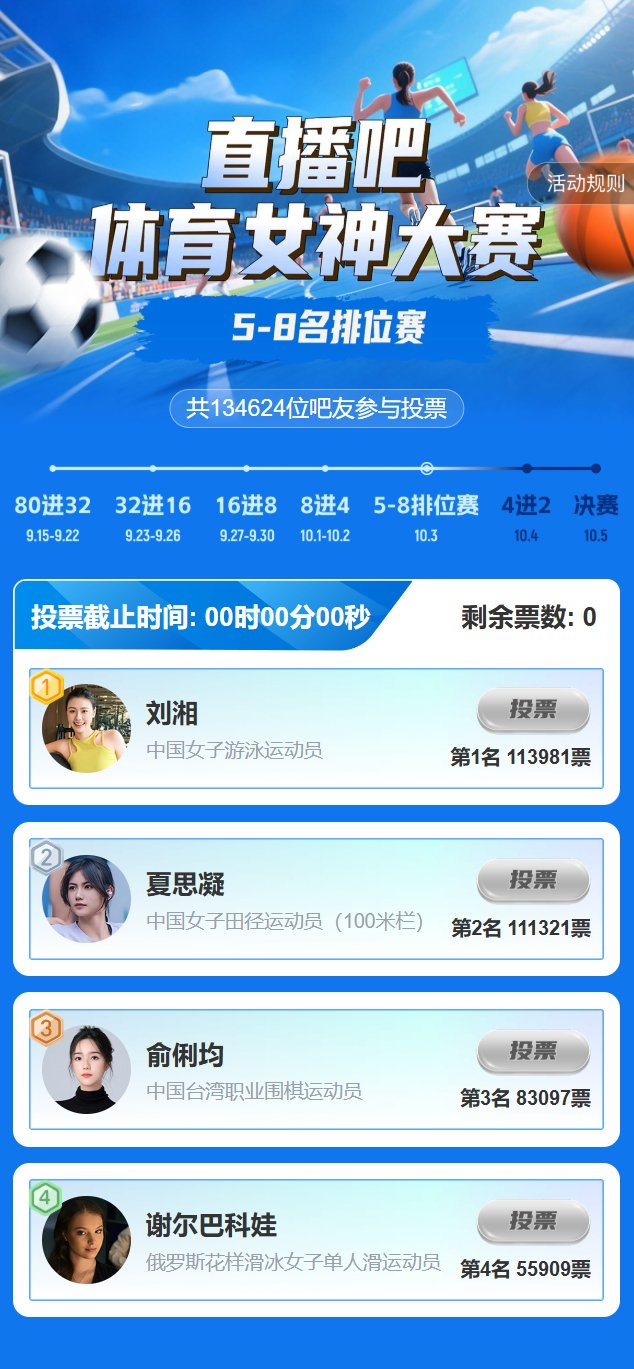2025年『直播吧体育女神大赛』5至8名排位赛今日战罢,刘湘险胜夏思凝,斩获本届女神大赛的第五名;