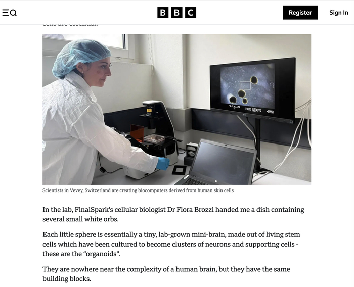 FinalSpark 的实验从人类皮肤细胞衍生的干细胞开始,这些干细胞来自日本的正规诊所,捐献者匿名。Jordan 博士补充说:“很多人主动来提供样本,但我们只选官方供应商,因为质量至关重要。”