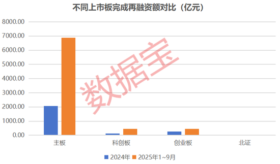 从其他板块来看,今年前三季度,双创板块再融资总额均超过上一年全年的水平。其中,科创板再融资额接近456亿元,较上一年全年增加超260%;创业板再融资额接近447亿元,较上一年全年增加近65%。
