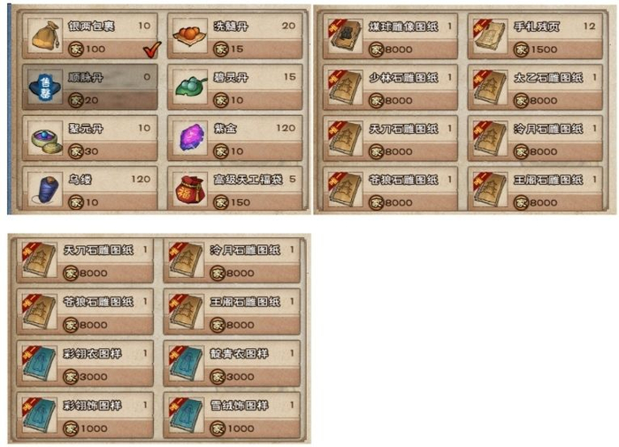 庭院含耳房与凉亭图纸,售价1500元宝;府邸含耳房、凉亭及游廊图纸,售价3000元宝。