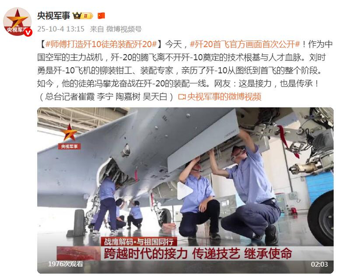 师傅打造歼-10徒弟装配歼-20 网友:这是接力,也是传承!
