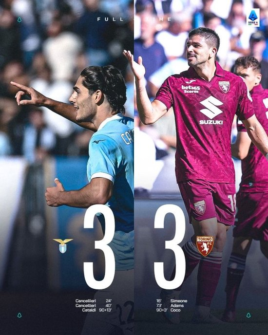 本场比赛上演神剧情,都灵16分钟由小西蒙尼先下一城,随后拉齐奥坎塞利耶里双响连扳两球反超比分,下半场比赛,都灵第73分钟依靠亚当斯再入一球2-2扳平拉齐奥。