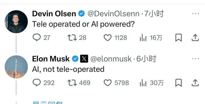 马斯克在评论区明确回应:“是AI,不是遥控。”