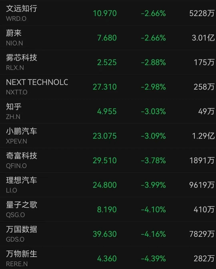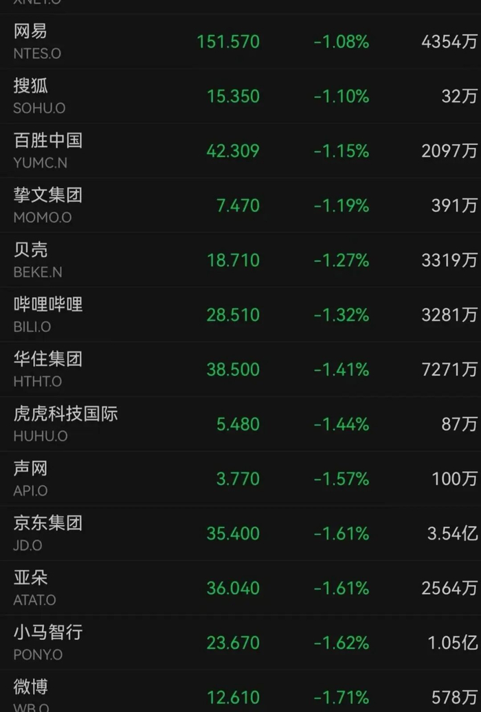 蔚来、小鹏汽车、理想汽车分别下跌2.66%、3.09%、3.99%。文远知行、网易、哔哩哔哩等分别下跌2.66、1.08%、1.32%。